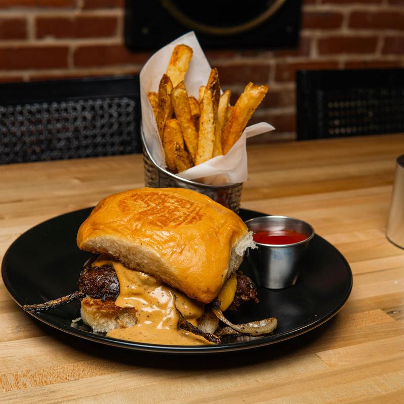 House burger "smashed" into onions, topped with American cheese, pickles & signature burger sauce