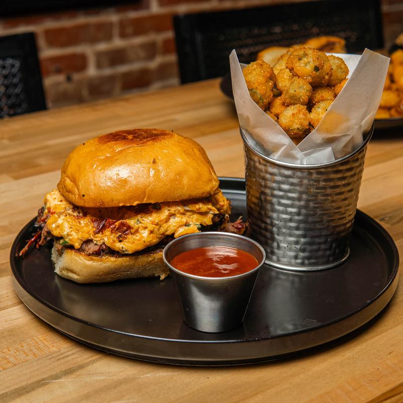 Our smoked brisket, topped with jalapeño pimiento cheese, served an a toasted potato bun with a side of our house-made BBQ sauce